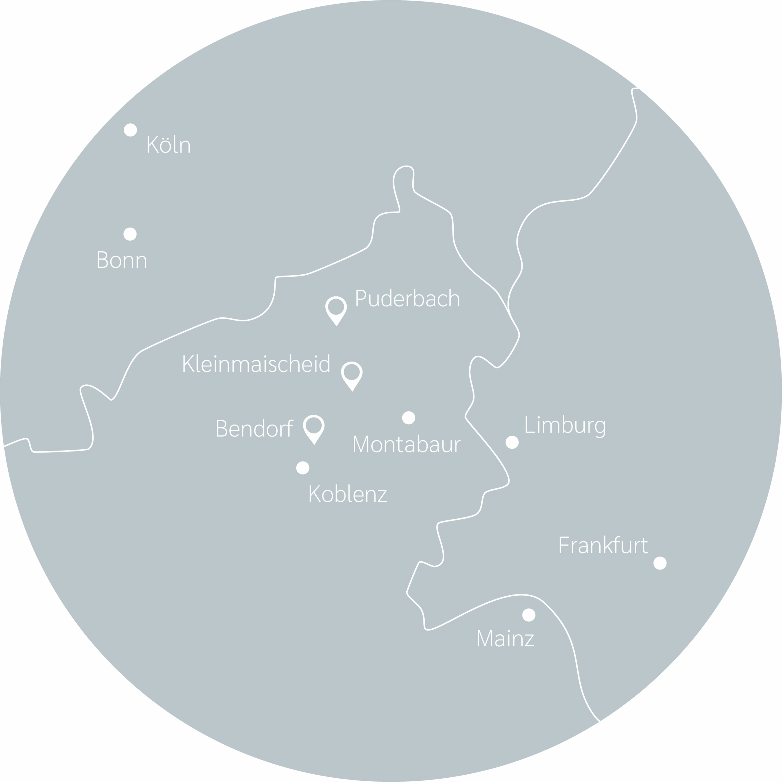 Unsere Präsenz erstreckt sich über drei Bundesländer: Rheinland-Pfalz, Nordrhein-Westfalen und Hessen. Mit einer tiefen Verwurzelung in dieser Region und umfassender Marktkenntnis begleiten wir Sie auf ihrem Weg rund um Immobilien – zuverlässig, flexibel und regional vernetzt.